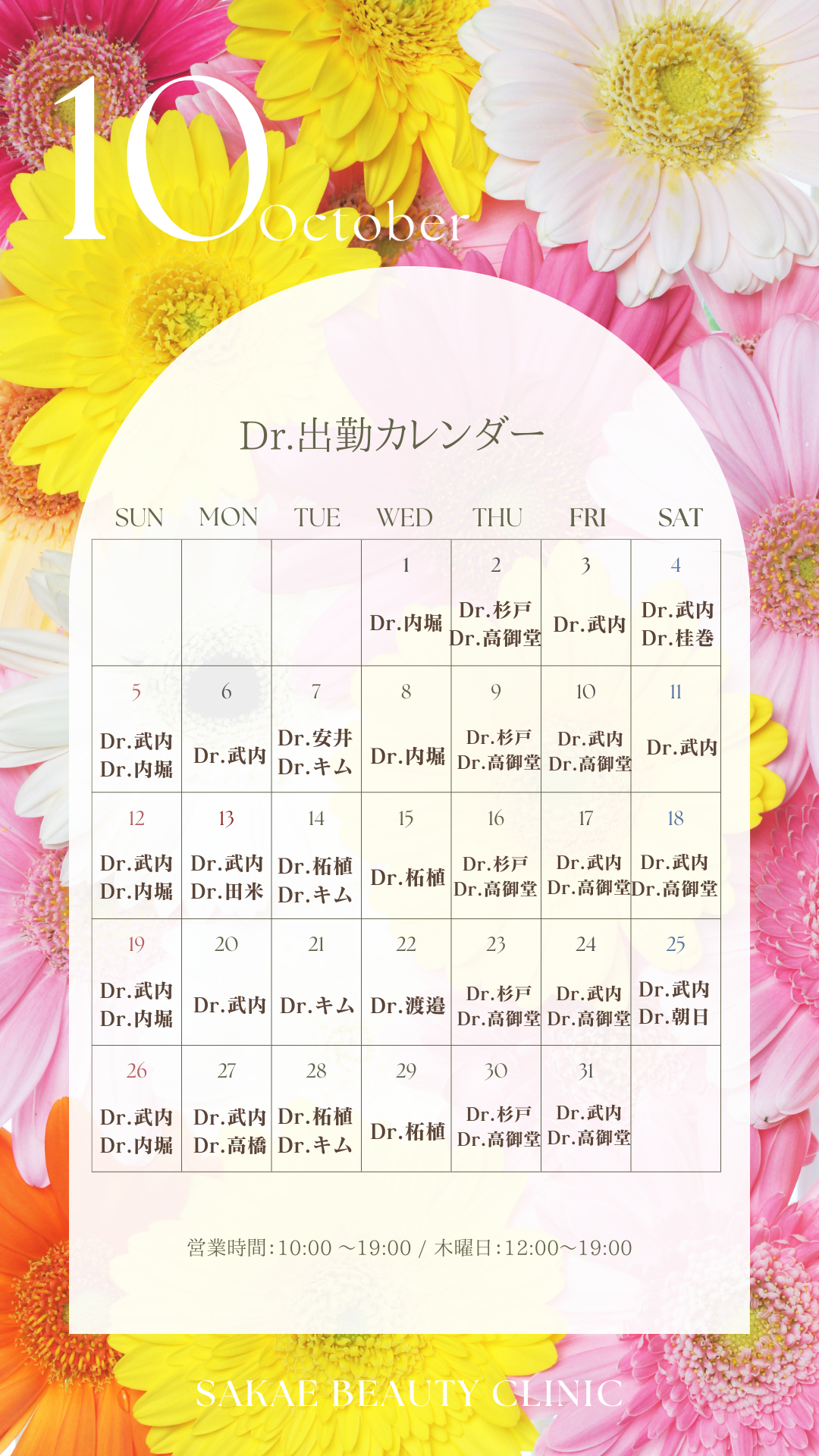 10月のドクター出勤カレンダーに変更がございましたので、差し替えさせていただきました。