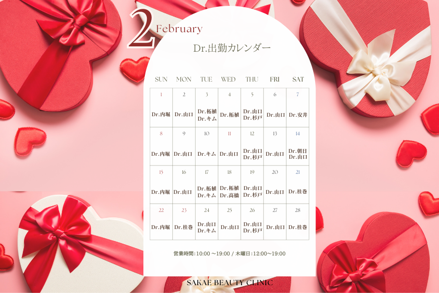 2月のドクター出勤カレンダーを公開させていただきました。 1月分とお間違いないようご確認くださいませ。 皆さまのご来院を心よりお待ちしております。 ご予約はTEL:052-212-8905またはLINEから受付しておりますのでぜひご予約ください。 お知らせ 1月ドクター出勤カレンダー公開のお知らせ 【2026/1/31まで】年末年始全施術最大70%OFFキャンペーン