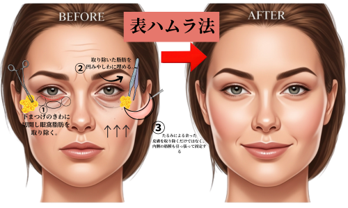 表ハムラ法は、目立たないまつ毛のキワから切開して、目の下のふくらみの原因となる眼窩脂肪を移動させ、凹凸を滑らかに整えたうえで余分な皮膚を切除する手術です。目の下の余分な皮膚も切除でき、皮膚のたるみやしわの改善も期待できます。