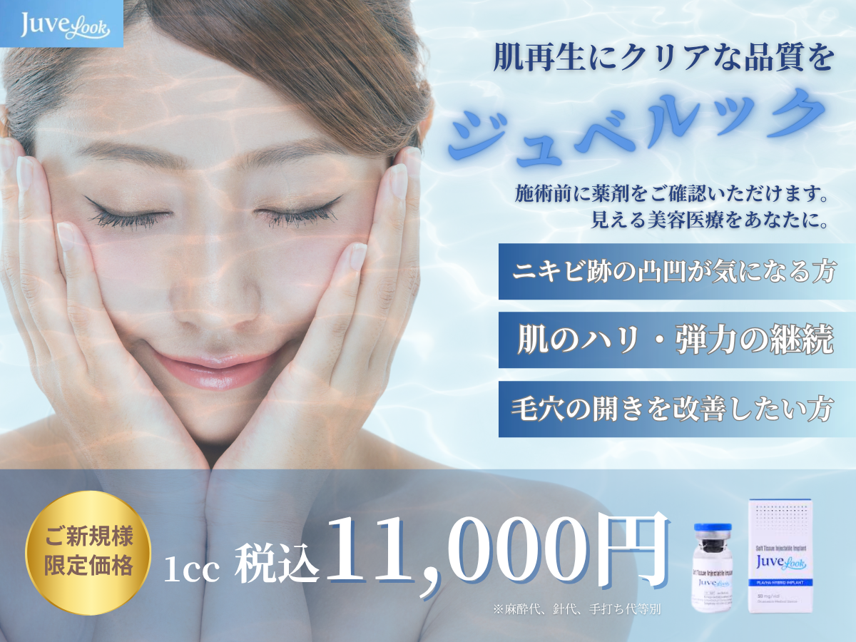 ジュベルック(Juvelook)は美容医療における次世代型の注入剤で、PDLLA(ポリ乳酸)と非架橋型ヒアルロン酸製剤を混ぜて使用します。注入後、皮膚内部からコラーゲン生成を刺激し、肌のハリ、たるみ・しわ・ニキビ跡・毛穴の開きを改善します。