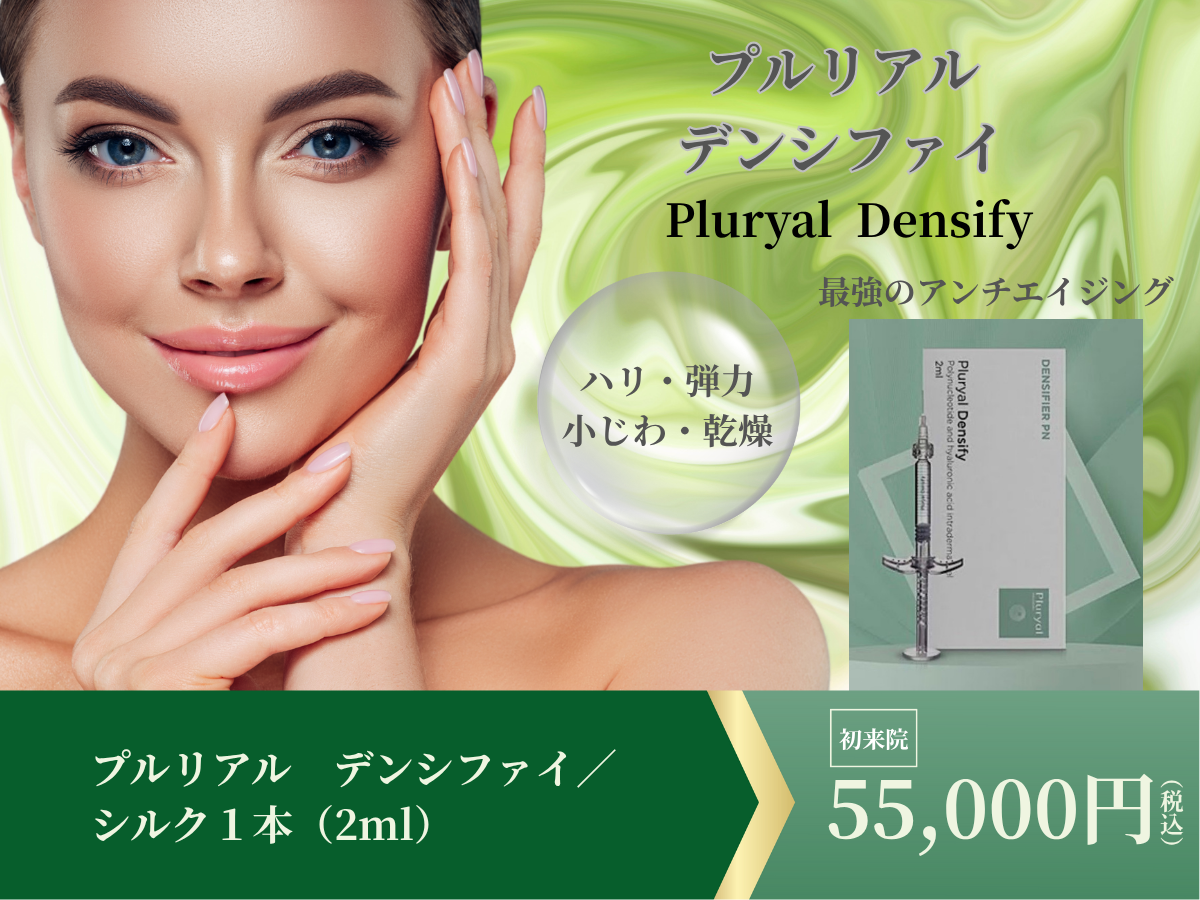 この中のプルリアル デンシファイ(PLURYAL DENSIFY)は、皮膚の修復作用のあるPN(ポリヌクレオチド)と、潤いと弾力性を向上させるHA(非架橋ヒアルロン酸)と、抗酸化作用+HAの分解を抑制させるマンニトールの混合成分で構成されています。肌質の向上やきめ細かな肌となり、海外では肌年齢の若返りの実績があります。