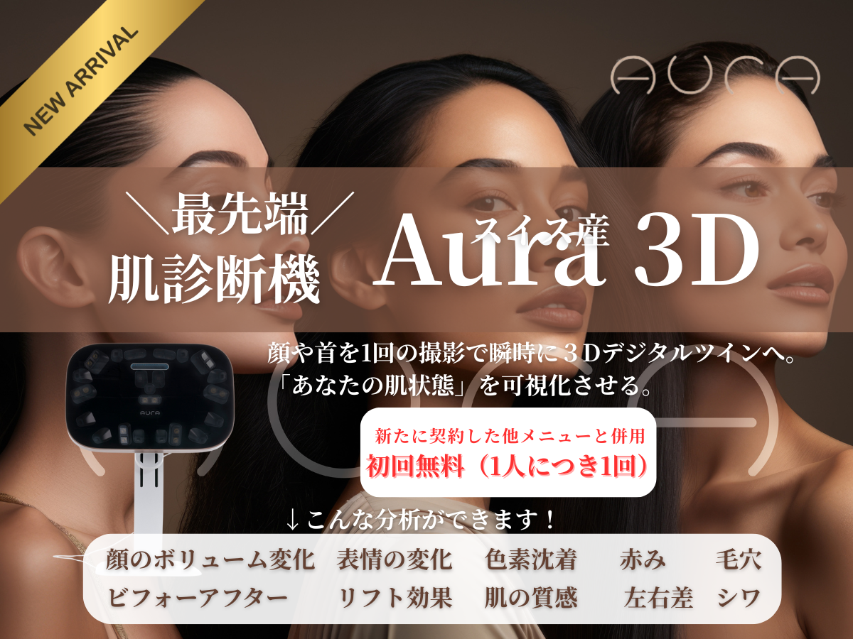 従来の2D写真や目視では分かりにくかった肌の悩みや変化も、Aura3Dなら高精細な画像とデータでしっかり確認できます。