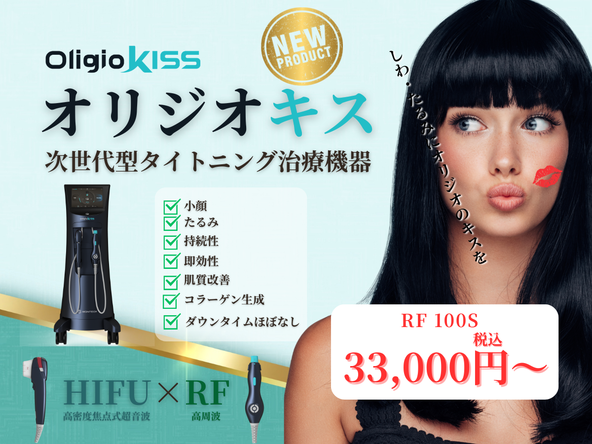 オリジオキス(Oligio Kiss)は、RF(高周波)とHIFU(高密度焦点式超音波)を組み合わせた最新型リフトアップ・美肌治療機器です。3つの層(表層・中層・深層)それぞれにアプローチする「トリプルモード」により、小じわ・たるみ・肌質改善を同時に叶えます。目元のたるみなど、パーツごとの集中ケアも可能です。