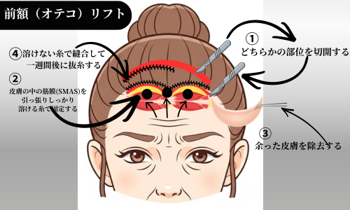 前額リフトとは、額を持ち上げて、眉毛を上げたり、上まぶたのたるみや額のしわを改善させたりする目的で行います。