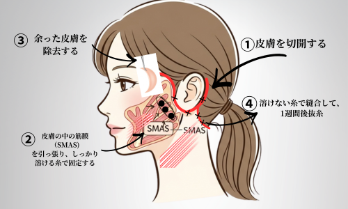 施術の説明:耳の付け根に沿って切開し、内部の筋膜を引っ張り溶ける糸で固定をして、皮膚のたるみを除去する施術です。
